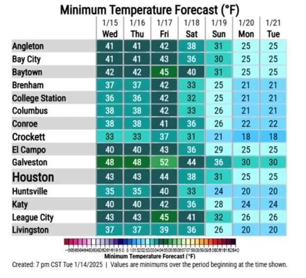 The Fort Bend County Emergency Services District No. 7 (FBCESD 7) Board of Commissioners would like to advise residents of potential freezing temperatures and cold weather conditions coming Sunday evening (1/19) and continuing to Friday morning (1/24) as the second forecasted cold front moves into our area over the weekend. While meteorologists are still uncertain regarding how cold it will get, there is the potential for a hard freeze in all non-coastal locations on Monday through Wednesday evenings and overnights.
